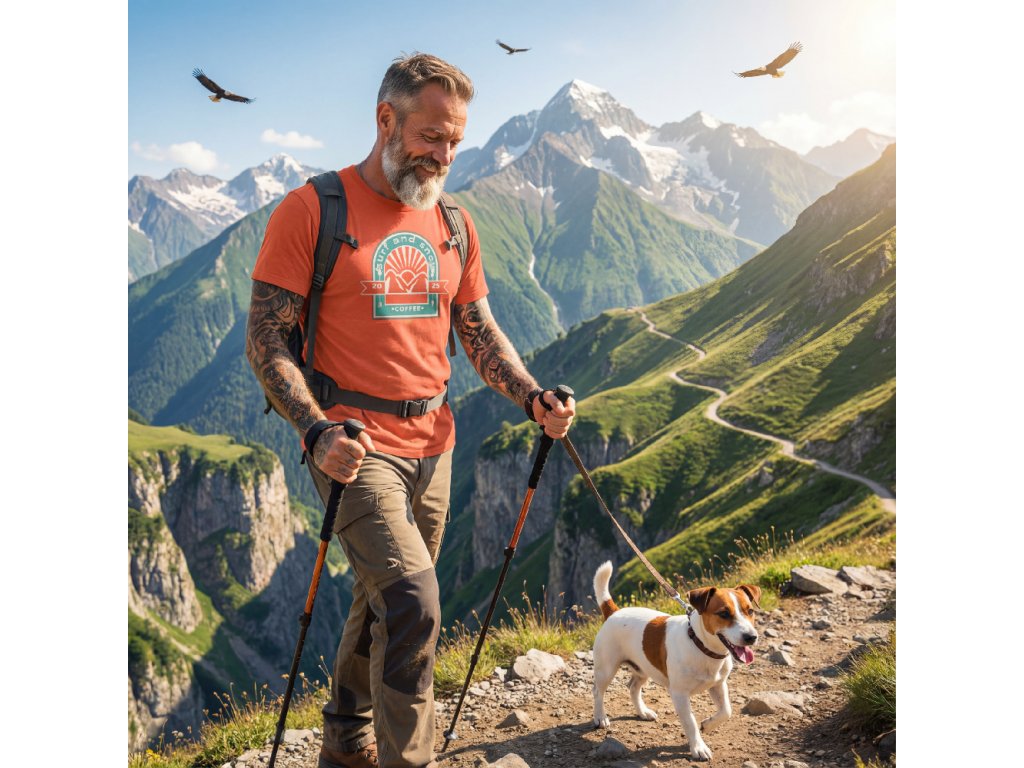 „Muž se psem ve vysokých horách, kde zasněžené vrcholky a létající orli připomínají, jak důležité je najít sám sebe. Hory nám přinášejí klid a odpočinek, a nejlepší parťák, kterého máme po boku, je pes. A právě tato motivace nás inspirovala k vytvoření našeho designu na tričko – objevuj krásu hor a relaxuj v přírodě.“